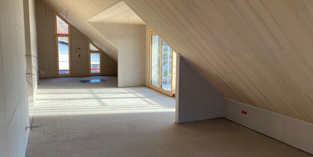 Das Mehrfamilienhaus in moderner Hybridbauweise nimmt weiter Form an. Auf dem aktuellen Bild ist das Dachgeschoss einer der entstehenden Wohnungen zu sehen – ein Raum, der schon jetzt durch seine hochwertige Ausführung und besondere Atmosphäre überzeugt.