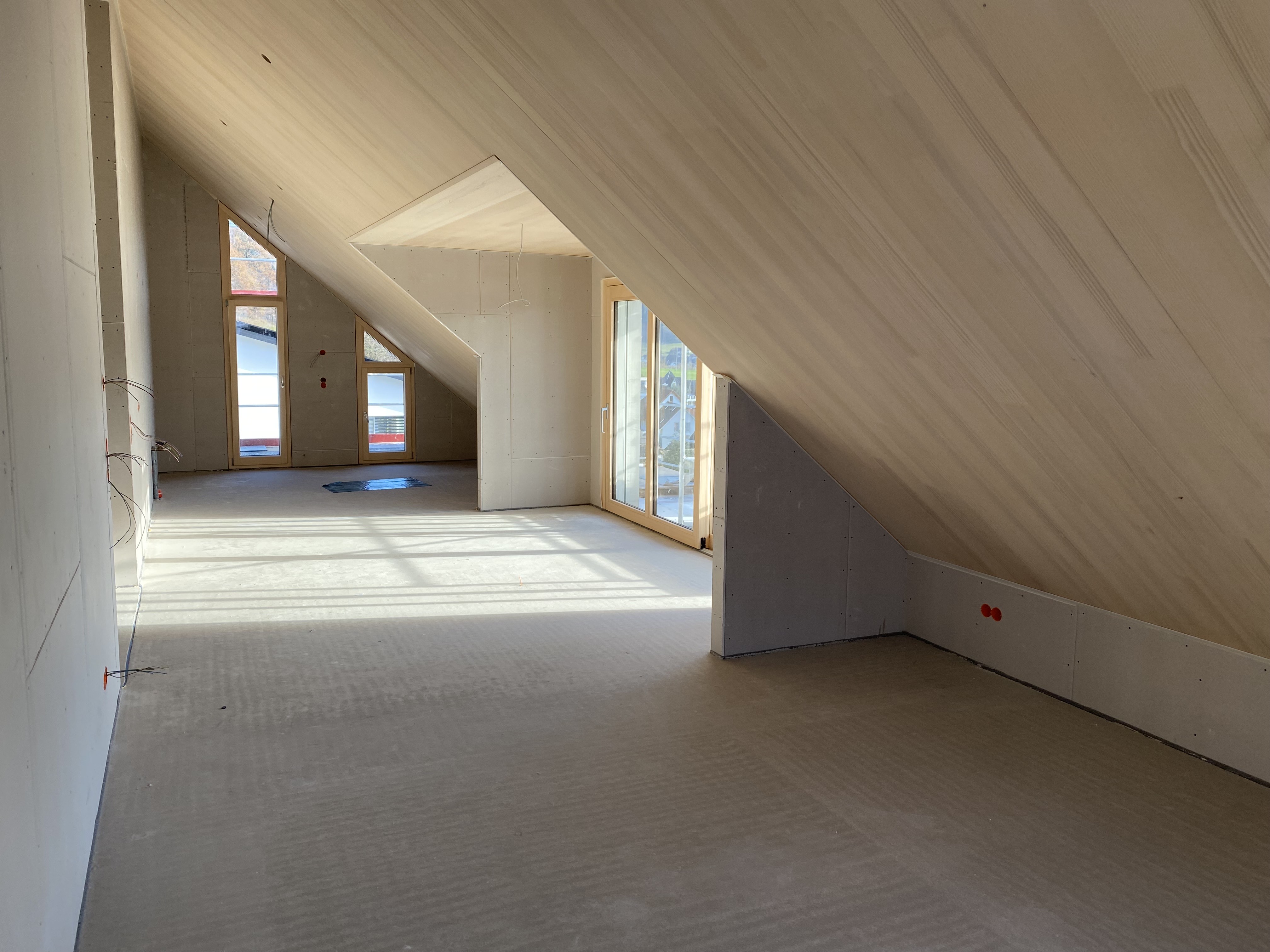 Das Mehrfamilienhaus in moderner Hybridbauweise nimmt weiter Form an. Auf dem aktuellen Bild ist das Dachgeschoss einer der entstehenden Wohnungen zu sehen – ein Raum, der schon jetzt durch seine hochwertige Ausführung und besondere Atmosphäre überzeugt.